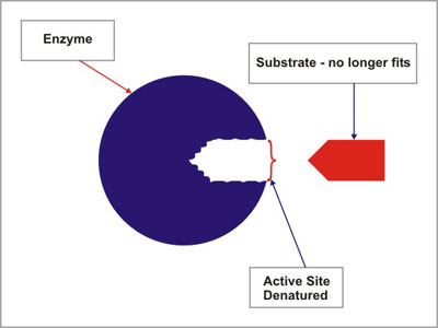 Enzymes are affected a great deal by temperature. If the temperature is too cold the enzymes move around too slowly to meet the substrate and for a reaction to occur. As the temperature increases though, so does the rate of reaction. This is because heat energy causes more collisions between the enzyme and the substrate. However as you will remember all enzymes are proteins and at too high temperatures the proteins break down. The active site of the enzyme becomes distorted and so the substrate no longer fits and hence the reaction does not occur. We say that the enzyme has been denatured.