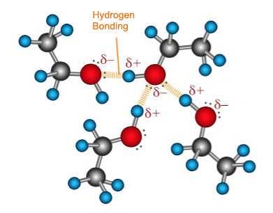 A mixture of ethanol (an alcohol) and water will be used to explain the process of distillation. The separation technique makes use of the difference in boiling points between the liquids in the mixture. However, before moving onto distillation it is important to gain an understanding on the key intermolecular forces at play. Both ethanol and water have strong intermolecular forces called hydrogen bonds. Without knowledge of hydrogen bonding one might deduce that ethanol with its greater molecular weight and size should have stronger intermolecular forces and therefore a higher boiling point than water. However, this is not the case due to hydrogen bonding.