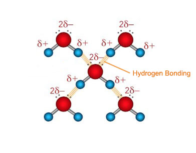 In water the hydrogen bond is formed due to the covalent bonds between one oxygen atom and two hydrogen atoms. Oxygen is a highly electronegative atom and attracts the electrons in the O—H bonds towards itself. Since the proton in the nucleus of the hydrogen atom is only slightly screened the action of the oxygen pulling the electrons away from the hydrogen results in a net positive charge on the hydrogen atoms. Consequently there is also a net negative charge on the oxygen atom resulting in an imbalance of charge across the water molecule. The overall water molecule is said to be polar because like a magnet it has two opposite charges on either ends (its poles). The net positive hydrogen atoms are readily available to attract the negative electron clouds from the oxygen atoms in adjacent water molecules. Unlike Van der Waal forces, hydrogen bonding involves a permanent imbalance of charge and therefore results in permanent dipole attractions. Hydrogen bonds are stronger than Van der Waal forces but weaker than covalent bonds. In water there are two O—H bonds and therefore each water molecule can form two hydrogen bonds. Each ethanol molecule on the other hand has only one O—H bond and thus forms one hydrogen bond with adjacent ethanol molecules.
